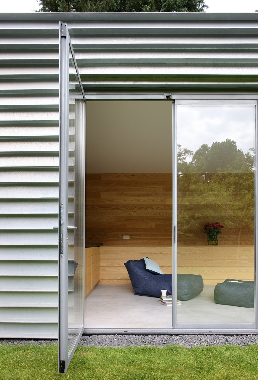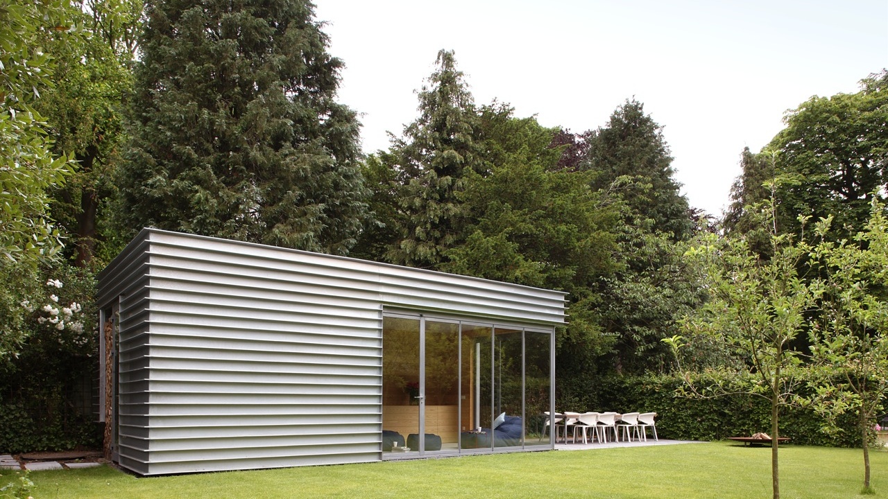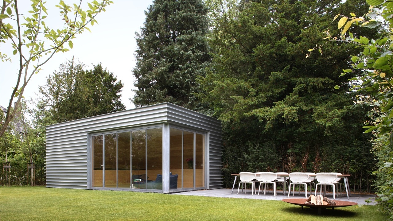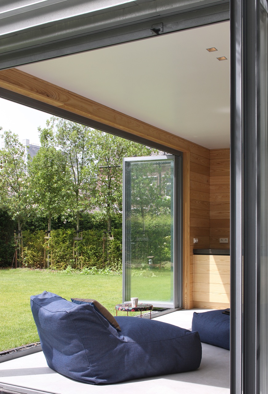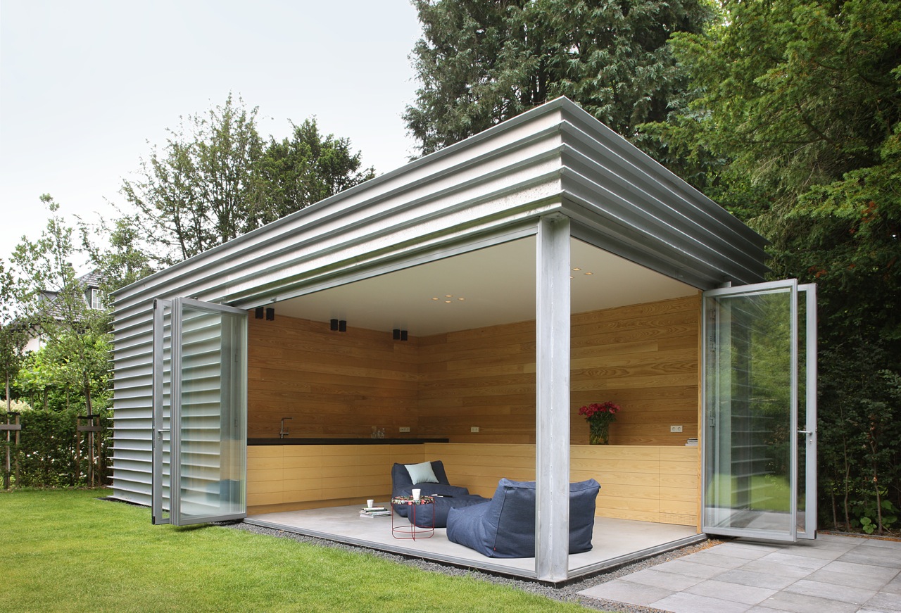 Garden house with storage space, wood storage, indoor entertaining area and outdoor dining space. Due to limited access to the garden, the house was prefabricated and lifted on site overnight. All finishings, appliances and lighting were mounted before transport. Once connected, the house was ready for use.
