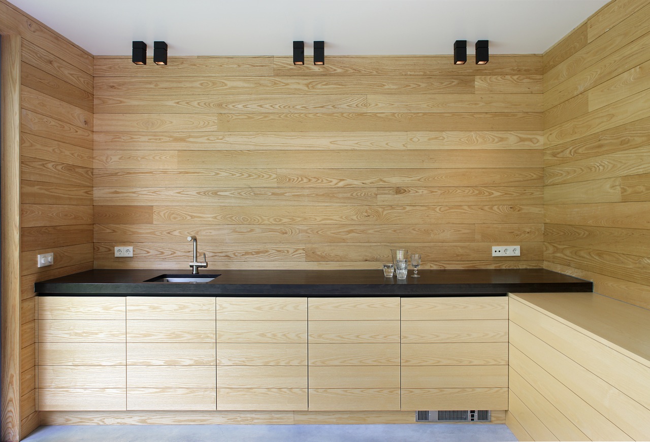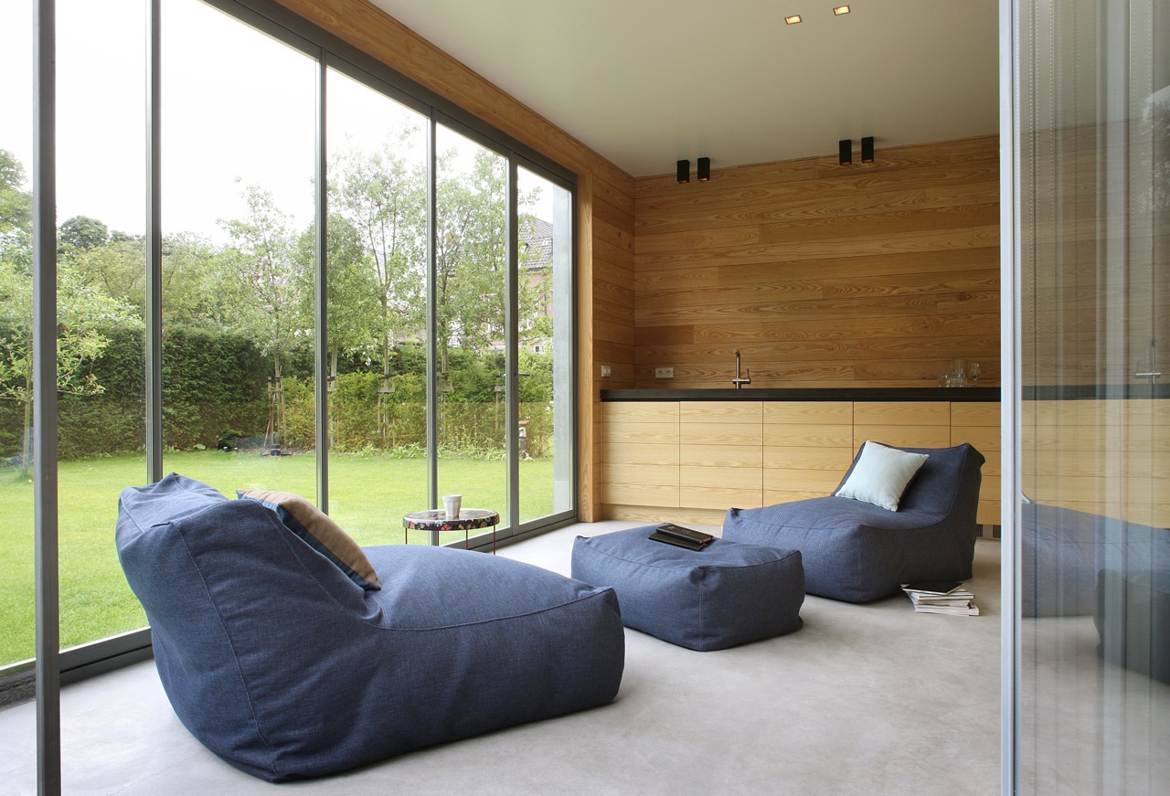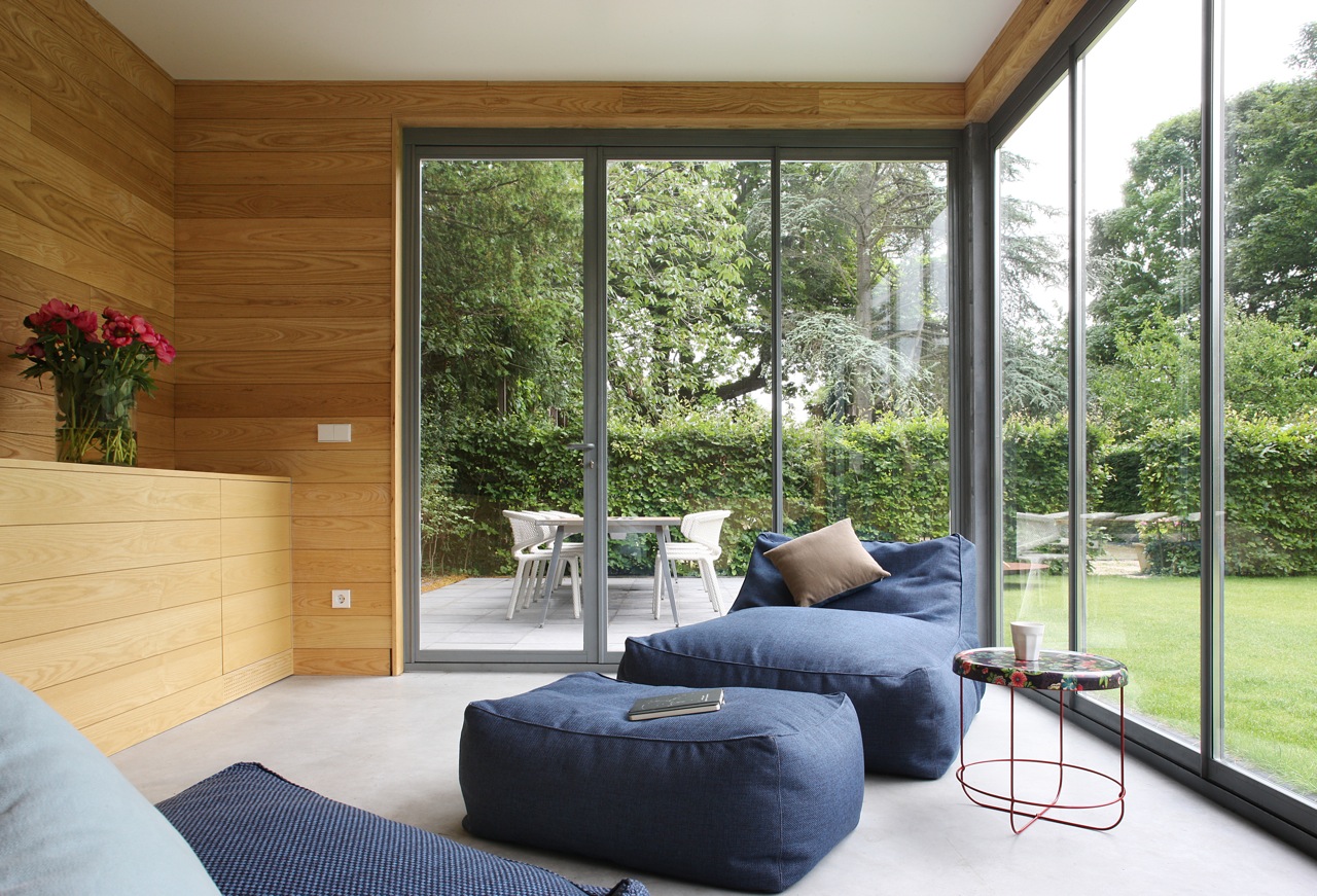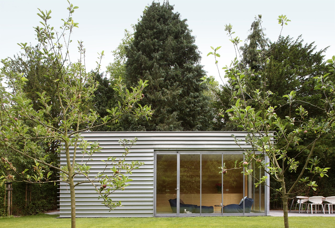Garden house with storage space, wood storage, indoor entertaining area and outdoor dining space. Due to limited access to the garden, the house was prefabricated and lifted on site overnight. All finishings, appliances and lighting were mounted before transport. Once connected, the house was ready for use.